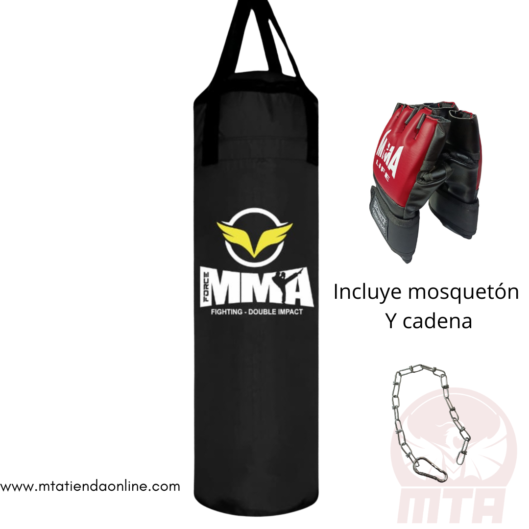 Saco MMAde 1.20 cm de alto + 1 pares de guantes de MMA Talla unica para entrenamiento de adultos. El saco se envía relleno de retal de tela 58 libras aprox.